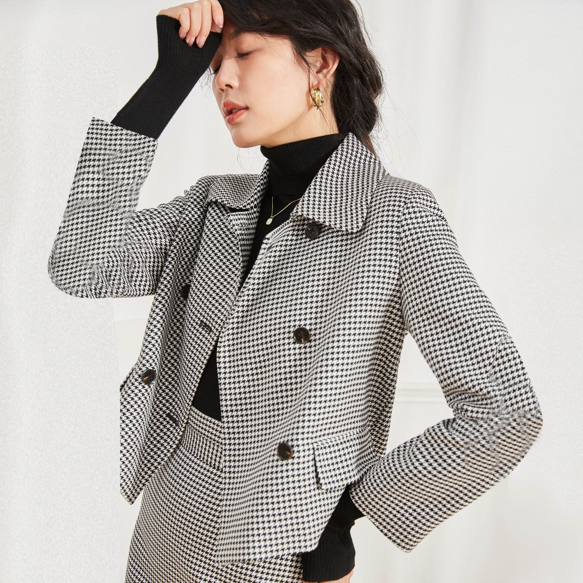 精心挑选的含羊毛精纺格子,图案纹理清晰,细密的各种千鸟各种有节奏的排列分布,相互之间有组成更大的格子。