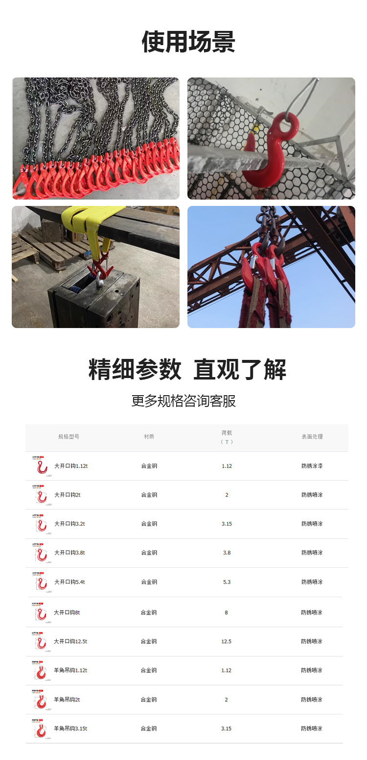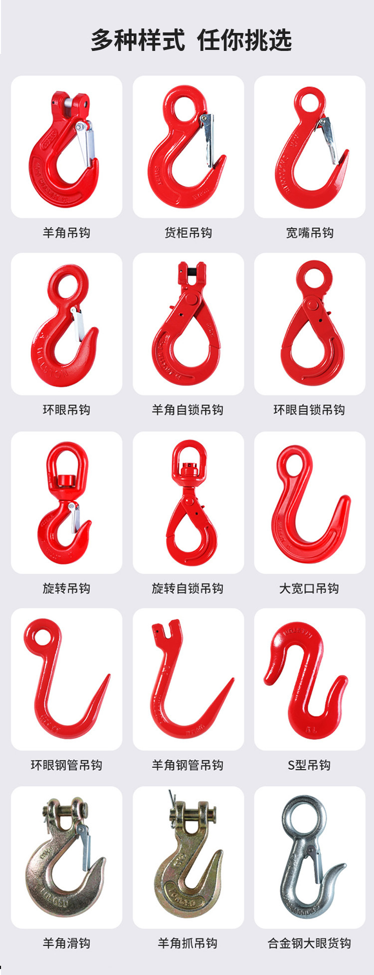 クロワッサンフック 1.12t,クロワッサンフック 2t,クロワッサンフック 3.15t,クロワッサンフック 5.3t,クロワッサンフック 8t,クロワッサンフック 12.5t,クロワッサンフック 15t,大開口フック 1.12t,大開口フック2t,大開口フック 3.2t,大開口フック 3.8t,大開口フック 5.4t,大開口フック8t,大開口フック 12.5t,アイフック 0.5t,アイフック 1t,アイフック 2t,アイフック 3t,アイフック5t,アイフック8t,鋼管フック 1t,鋼管フック 1.12t,鋼管フック 3.2t,アメリカンスイベルフック 1t,アメリカンスイベルフック 2t,アメリカンスイベルフック 3t,アメリカンスイベルフック 5t,アメリカンスイベルフック 7t,アメリカンスイベルフック 11t,S型フック1t,S型フック2t,S型フック3t,S型フック5t,S型フック8t,S型フック10t,アイ型安全フック 1.12t,アイ型安全フック 2t,アイ型安全フック 3.15t,アイ型安全フック 5.3t,アイ型安全フック 8t,アイ型安全フック 12.5t,アイ型安全フック 15t,アイ型安全フック 21.2t,羊角安全自锁フック 1.12t,羊角安全自锁钩2t **Translation:** 羊角型安全ロックフック 2t,羊角安全自锁钩3.15t **Translation:** 羊角型安全ロックフック 3.15t,羊角安全セルフロックフック 5.3t,羊角安全自锁钩8t **Translation:** 羊角型安全ロックフック 8t,羊角安全自锁钩12.5t **Translation:** 爪付き安全シャックル 12.5t,羊角安全セルフロックフック 21.2t,コンテナフック2t,コンテナフック 3t,コンテナフック5t,コンテナフック8t,クロワッサンウィングフック 1.12t,クロワッサンウィングフック 2t,クロワッサンウィングフック 3.15t,クロワッサンウィングフック 5.3t,クロワッサンウィングフック 8t,クロワッサンウィングフック 12.5t,クロワッサンウィングフック 15t,羊角グラップリングフック 1t,クロワッサン グラップリングフック 2t,クロワッサン グラップリングフック 3t,クロワッサン グラップリングフック 4t,羊角グラップリングフック 5t