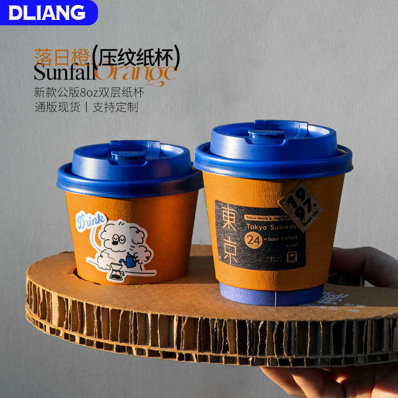 一次性咖啡纸杯落日橙压纹纸杯双层隔热外卖热饮防漏纸杯印刷logo