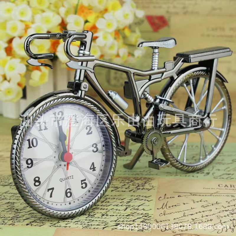 古風な自転車の目覚まし時計の学生のベッドの上で時計の子供のプレゼントを起こします。