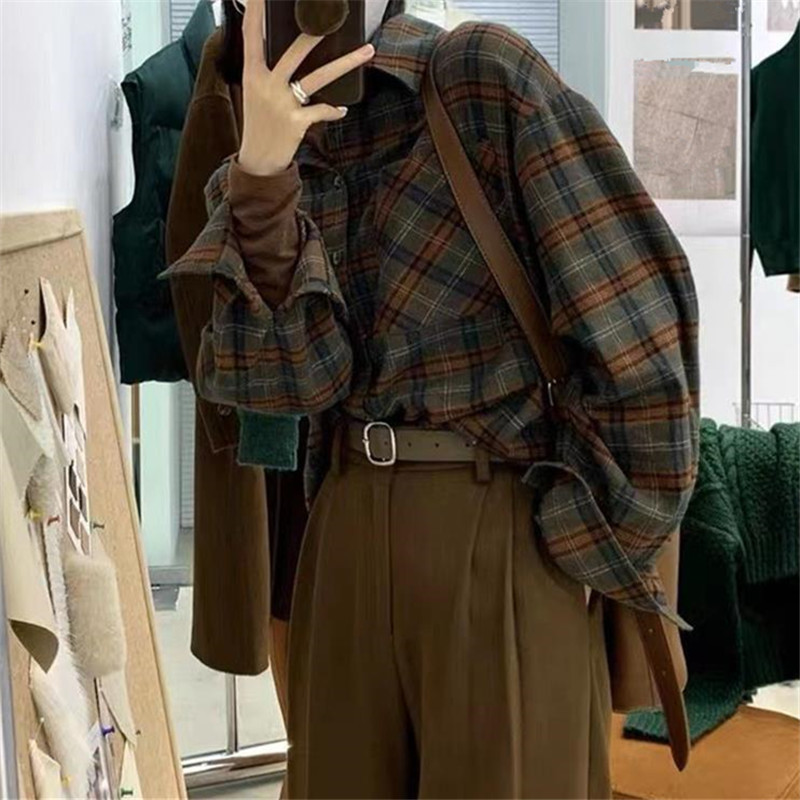 毛の格子のシャツの女性のデザイン感の小さい大衆の上着の秋の復古の港の味はゆったりしています。