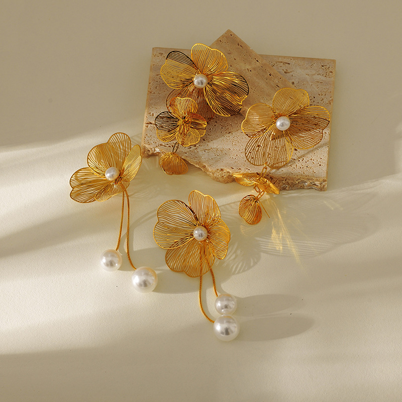 欧米の国境を越えた金属感立体花ピアス女性の甘いクールなins風流蘇金メッキステンレスイヤリング耳飾り