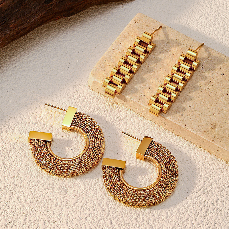欧米の国境を越えた熱売編みメッシュ幅C型耳輪耳釘ステンレスメッキ18k金個性イヤリングアクセサリー