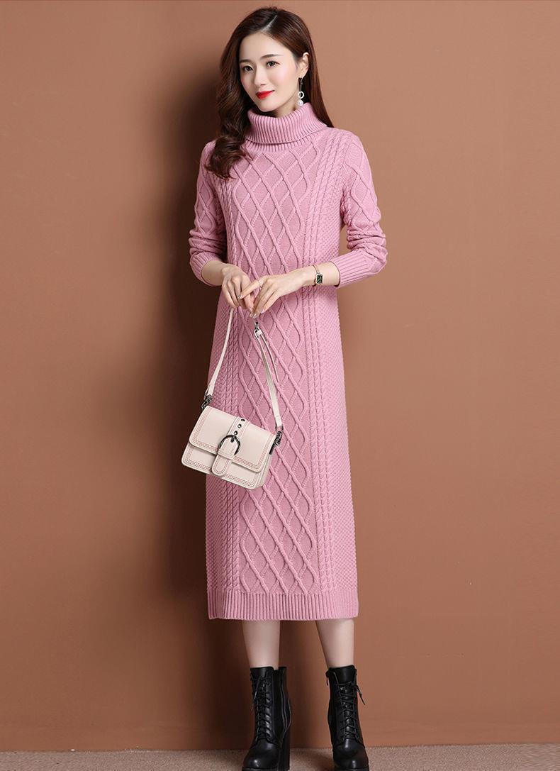 中長の膝を越えたニットのスカートの女性の半高襟のゆったりとした保温の中に長袖のスカートを合わせます。