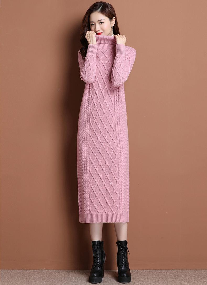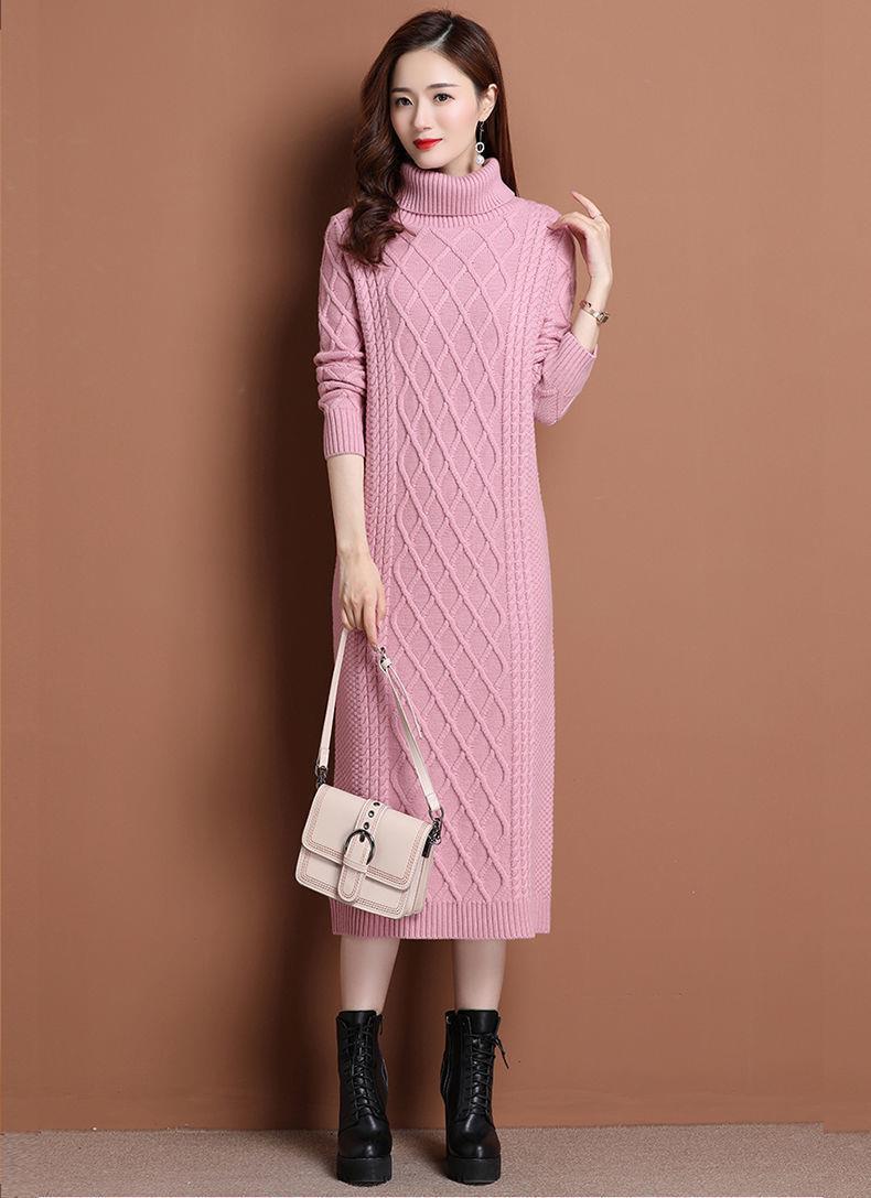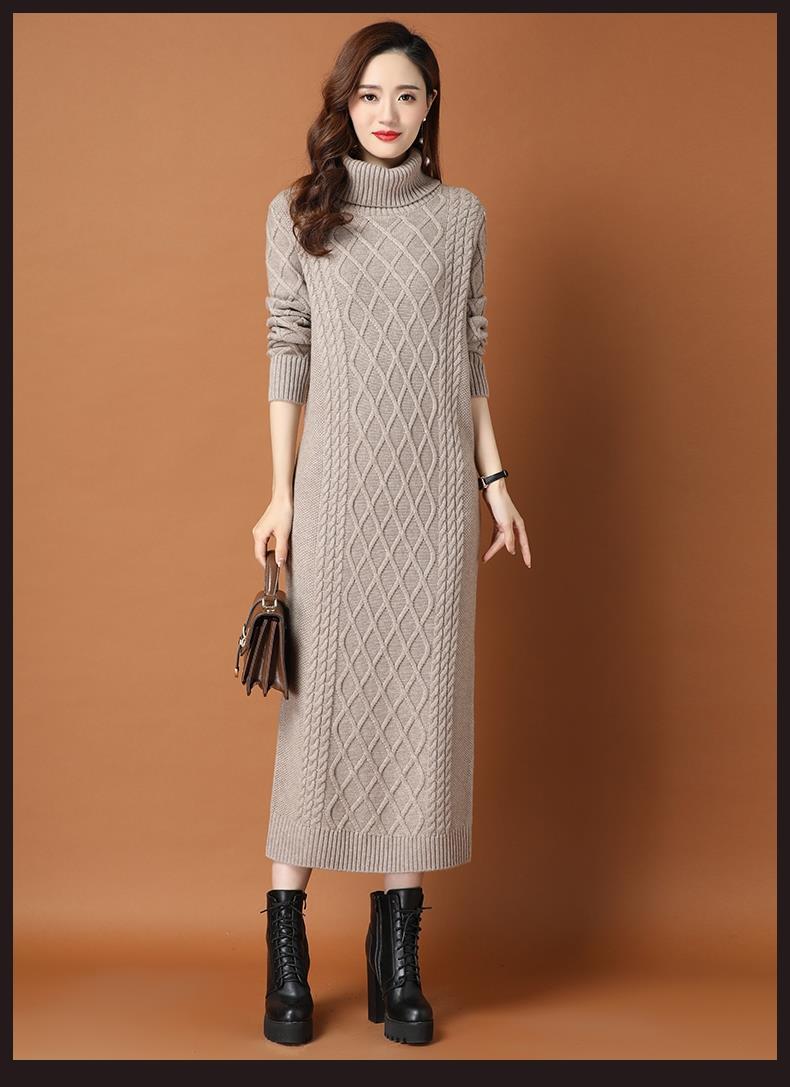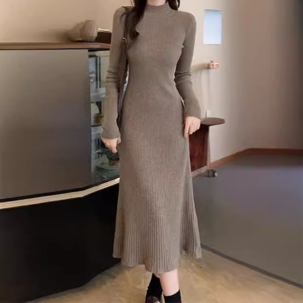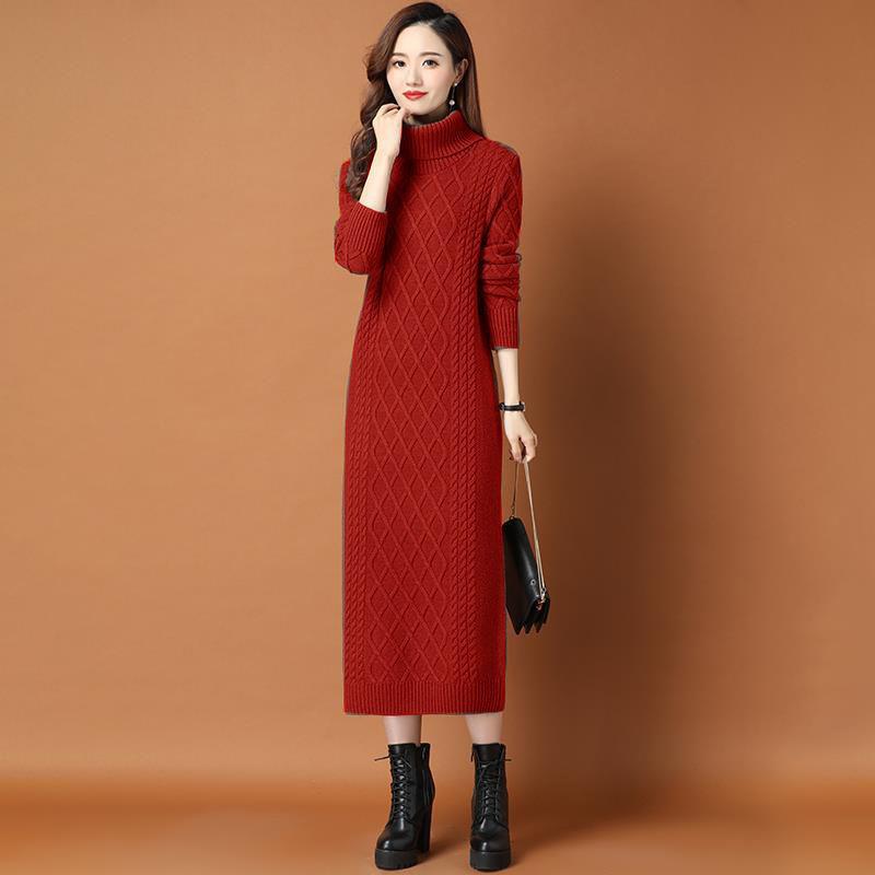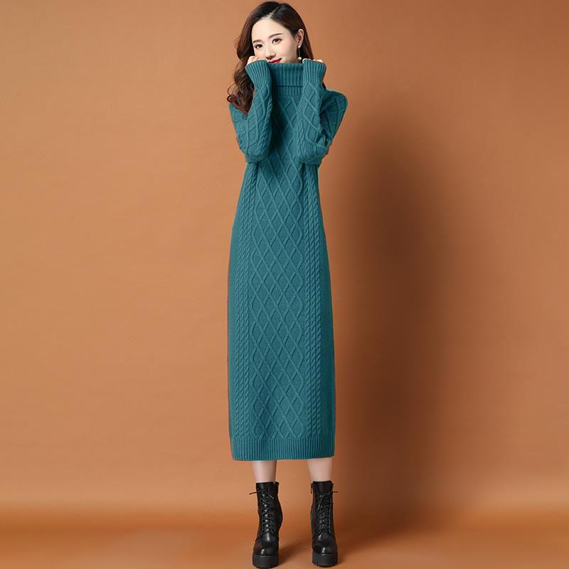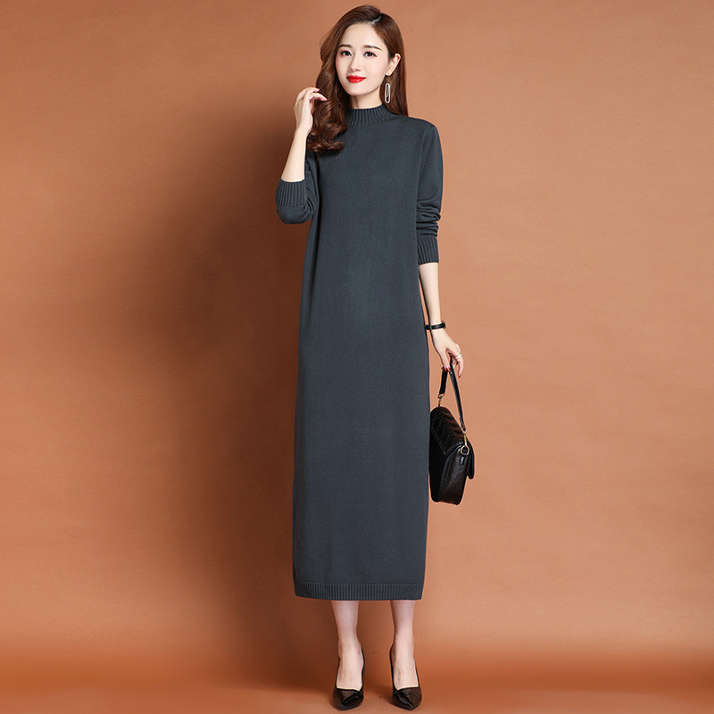 ニットのワンピースの女性の秋冬の新型の半高襟の長いスカートの純色の長袖の毛のワンピースの中で膝を越えてスカートを打ちます。