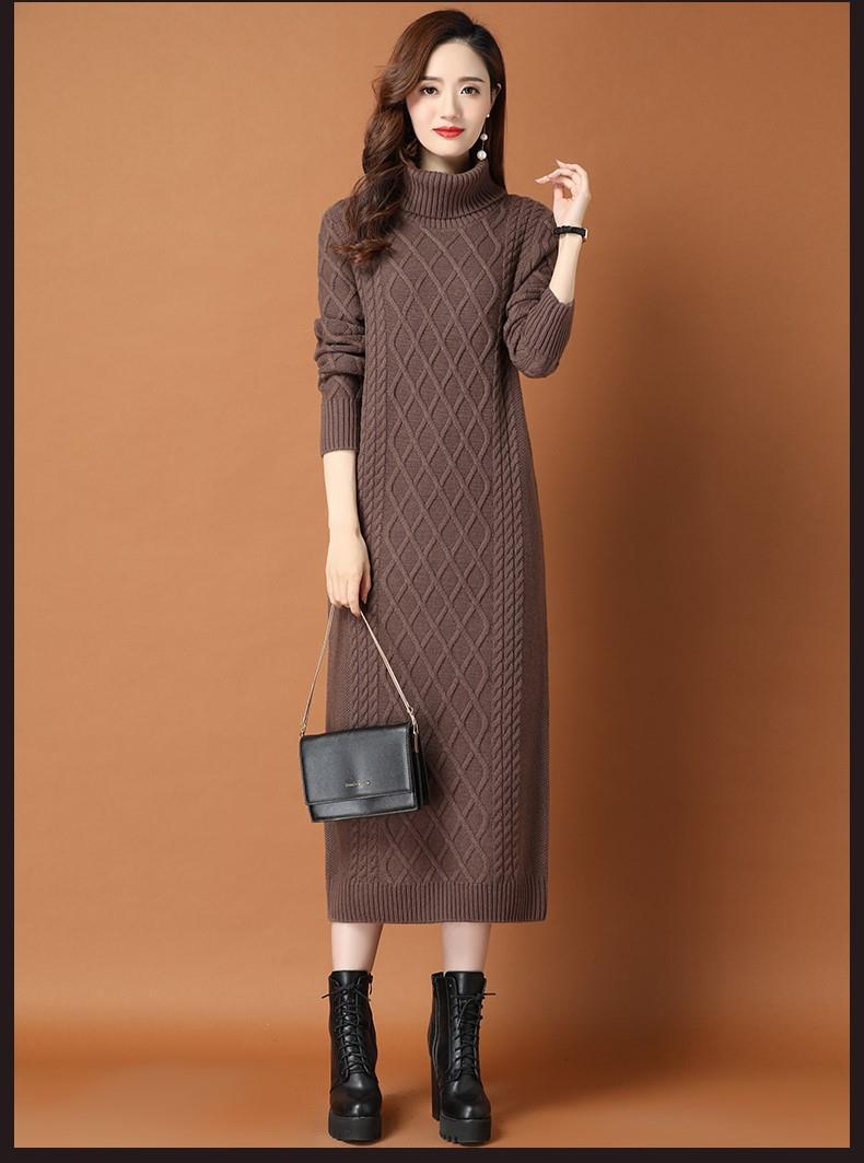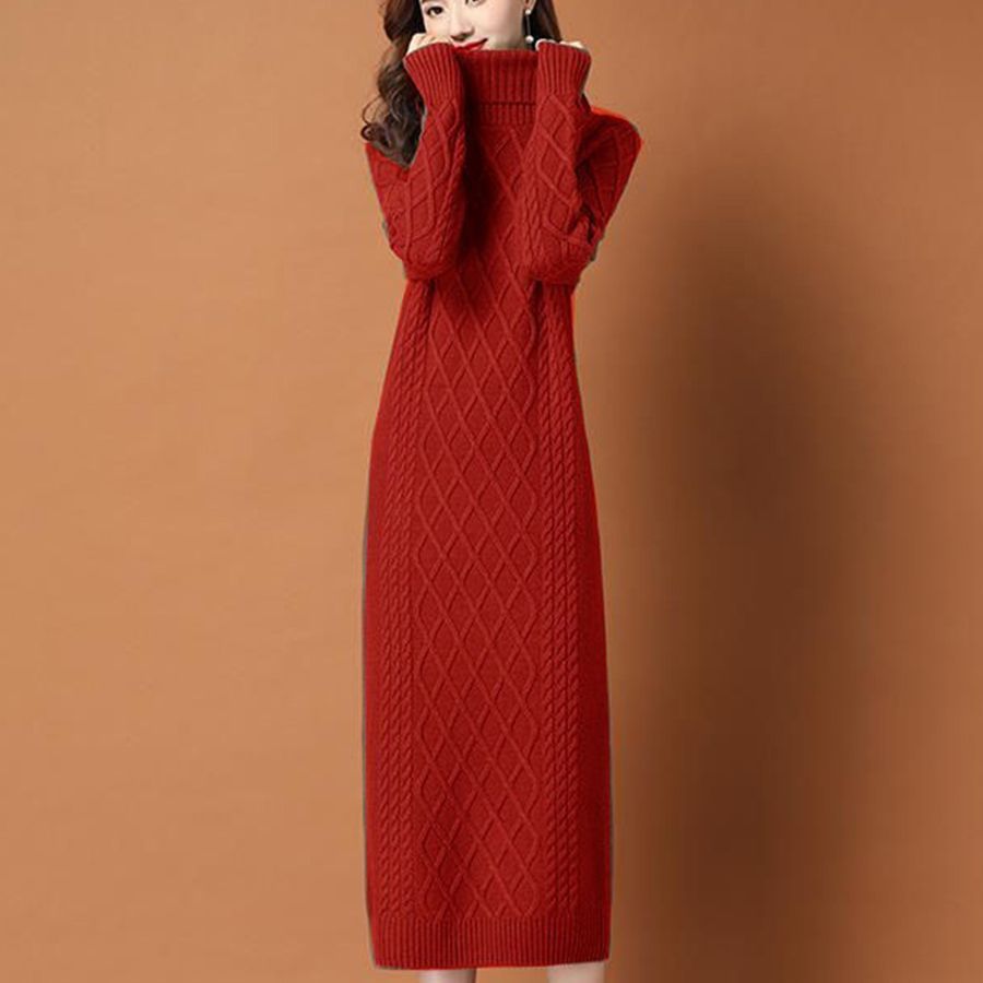 ロング丈のニットワンピース、膝丈、2025秋冬新作、厚手、ハイネック、着痩せ効果、コートに合わせやすい、女性用ニットワンピース