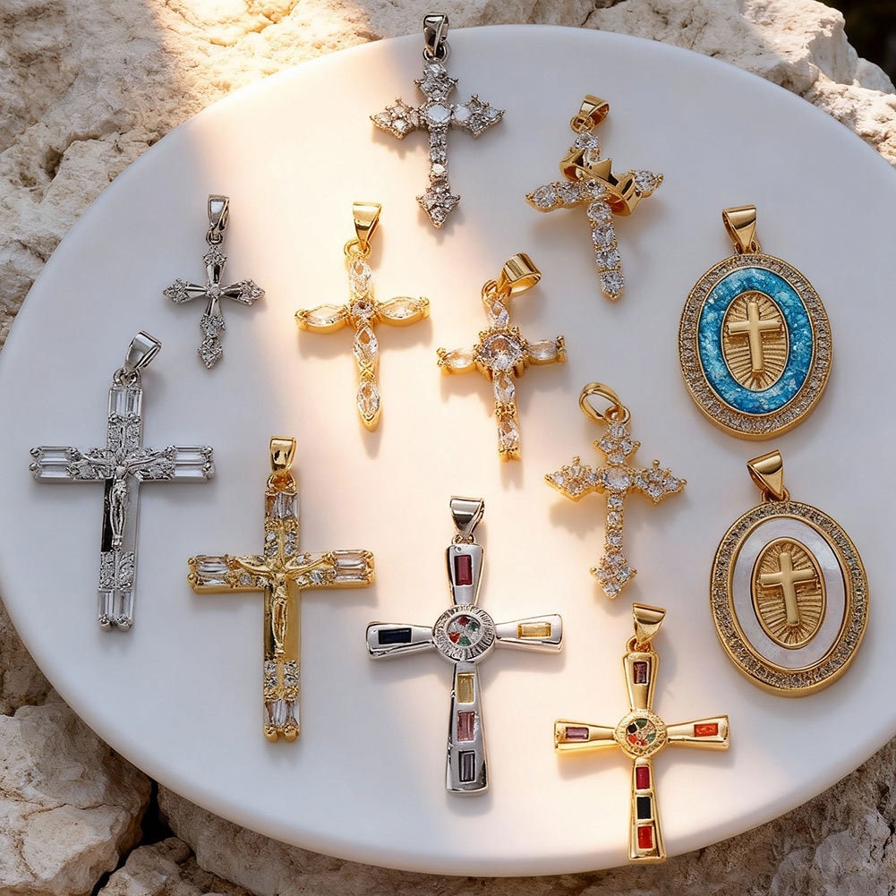 欧美跨境十字架吊坠铜镀真金保色轻奢潮流饰品配件DIY锆石挂件