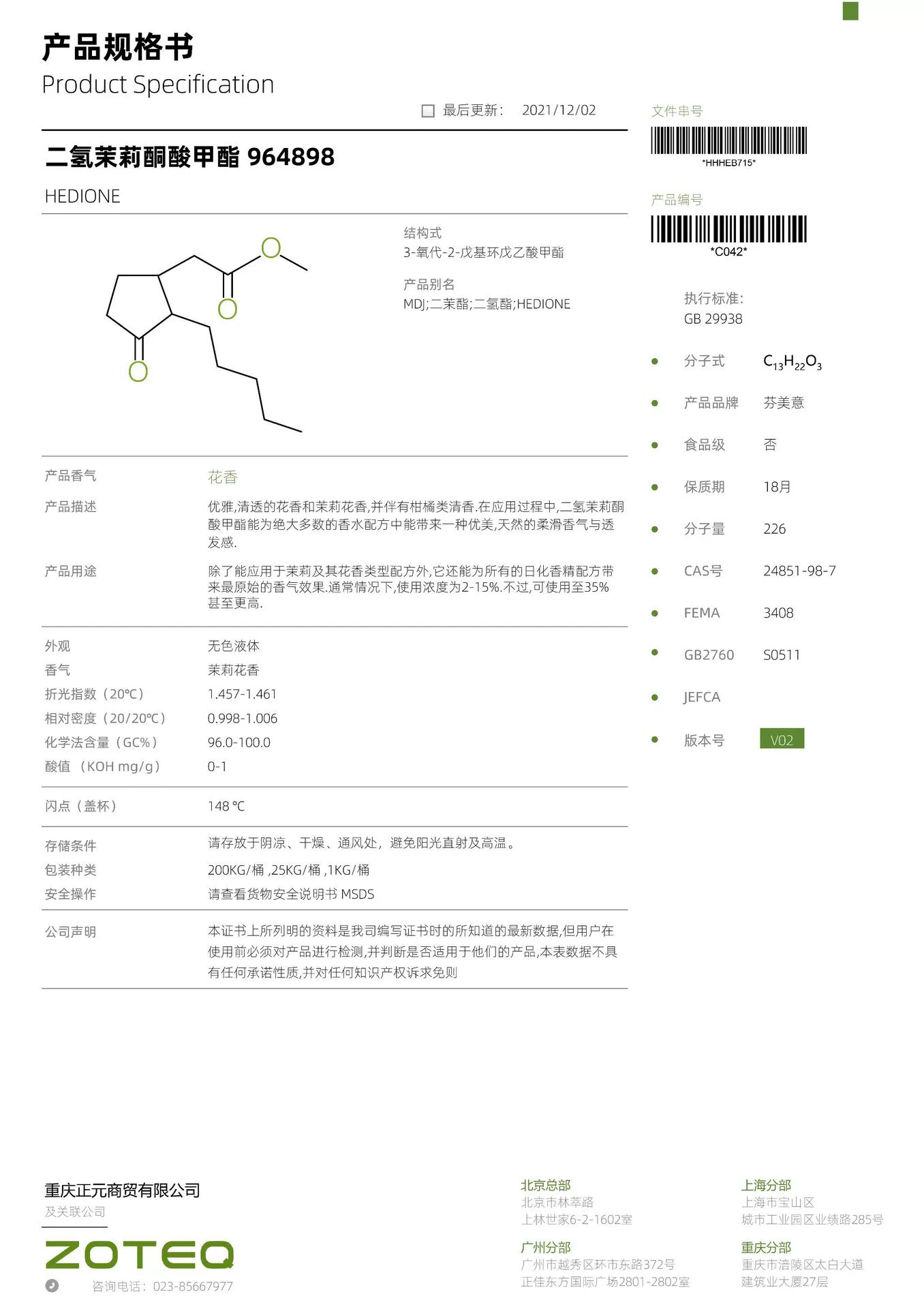 [サンプル] 芬美意-二水素ジャスミン酸メチルHedione 964898 _ 24851-98-7