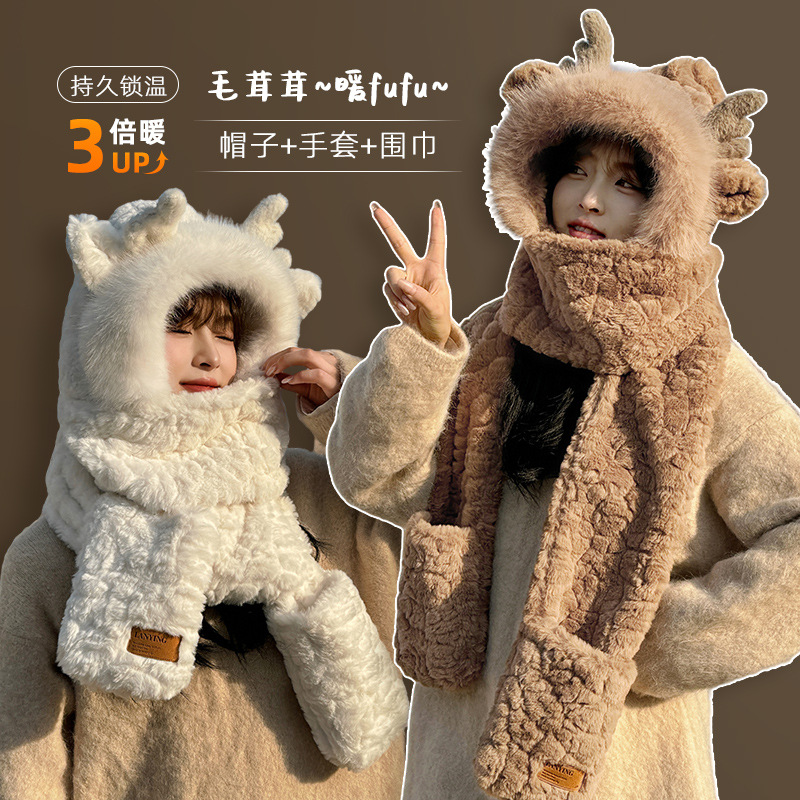 韩版鹿角毛绒加厚帽子围巾手套一体女冬季保暖围脖连帽骑行套头帽