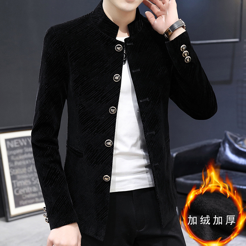 外套男士加绒加厚秋冬季韩版中山装青年潮流帅气立领西装唐装夹克