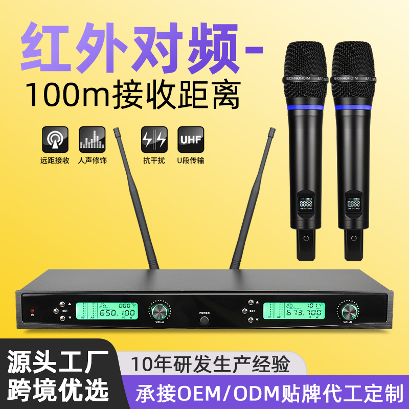 跨境无线麦克风手持动圈话筒防啸叫一拖二舞台话筒声卡直播麦克风