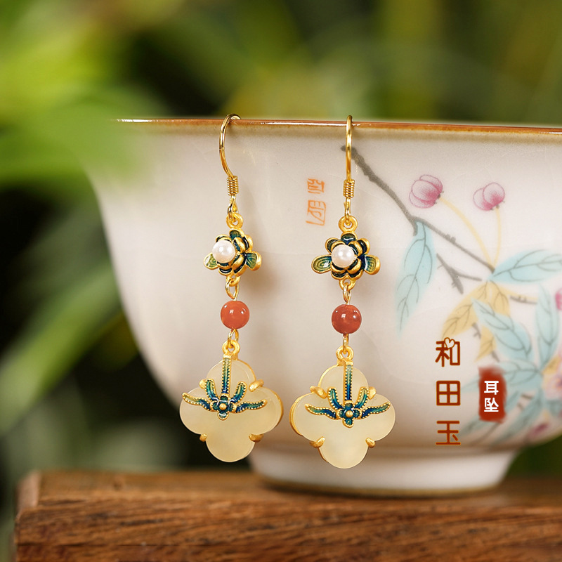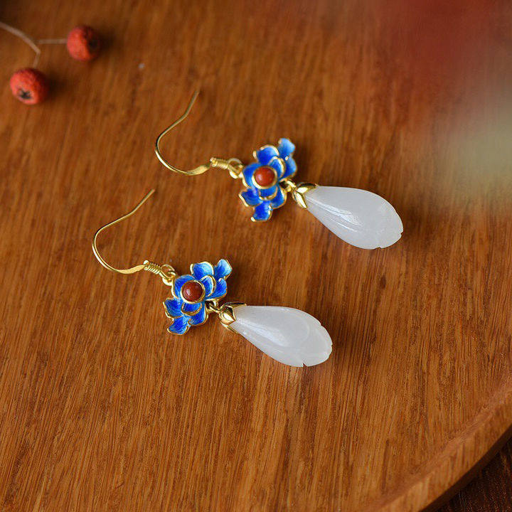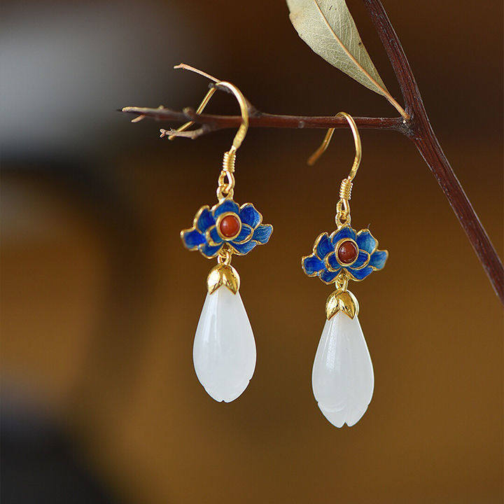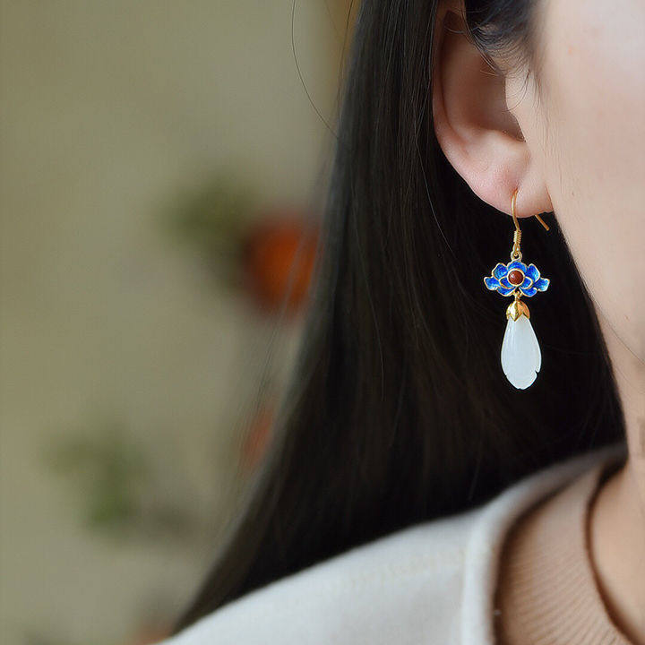 925銀金メッキモザイク景泰藍白玉髄古風国潮宮廷風気質レトロ女性ファッションイヤリング