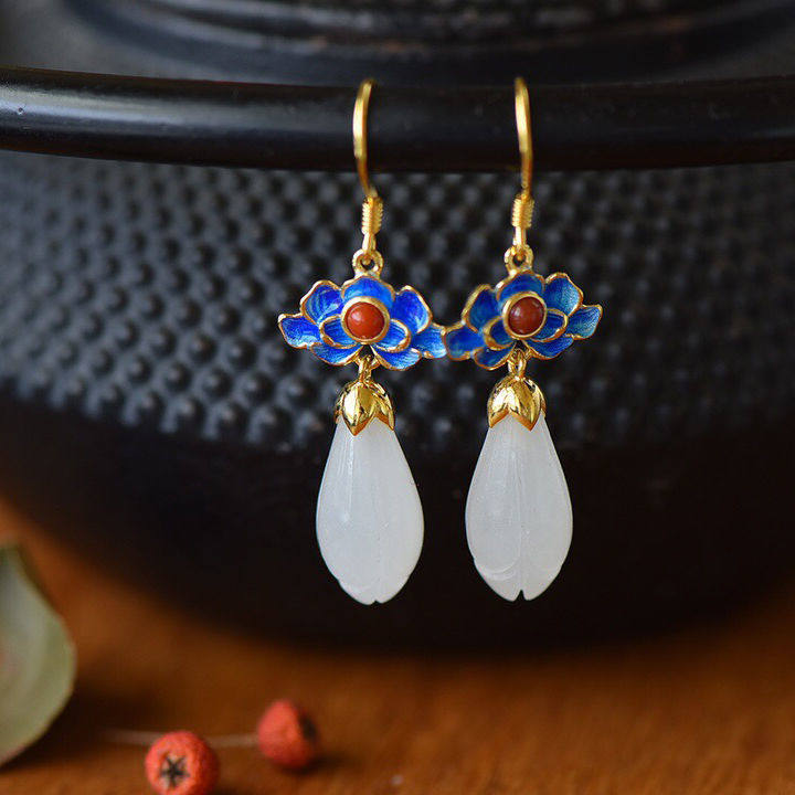 エスニックスタイルの伝統的な金箔工芸品、東洋の古典的な絵付けエナメルイヤリング、蓮のタッセル、ホータンイヤリング、イヤリング