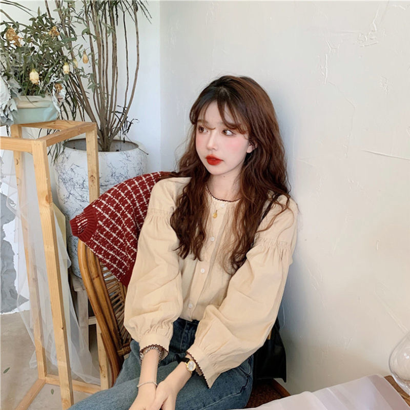 長袖シャツレディースルーズ2025春秋新作韓国風パフスリーブ学生ラウンドネックシャツ日本製万能トップス