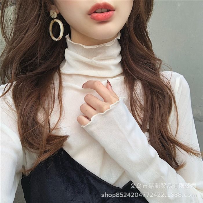 レースボトムシャツレディーススリムハイネック長袖薄手メッシュトップ春秋白耳Tシャツトレンド