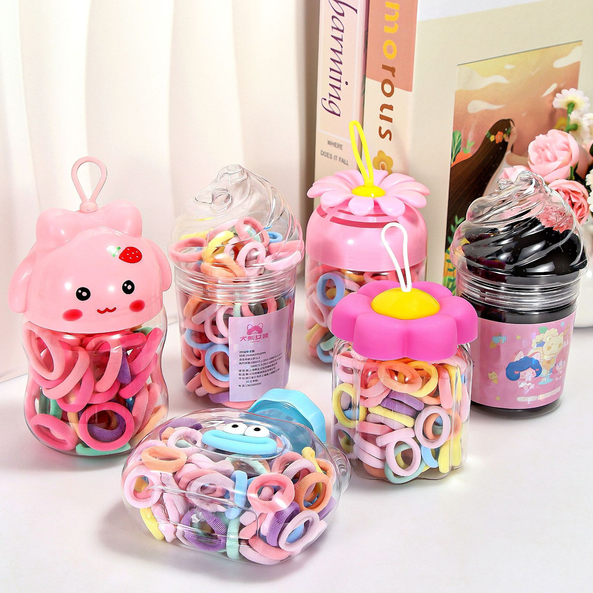 子供用の髪ひもを瓶に入れて髪飾りをします。女の子の使い捨ての皮筋は黒いです。