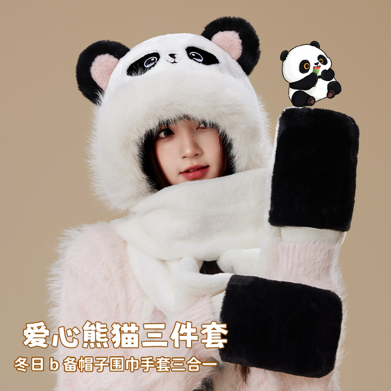 爱心熊猫帽子围巾三件套一体防风保暖可爱毛绒围脖套熊猫三件套