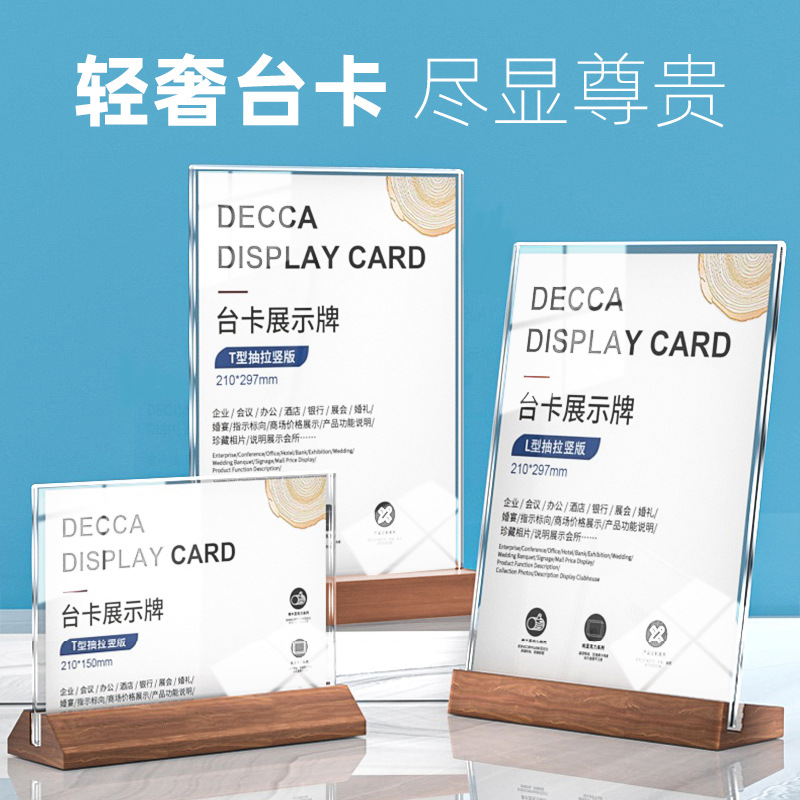 跨境A4亚克力台卡A5台签双面桌牌加厚A6餐牌价格牌木质底座展示牌