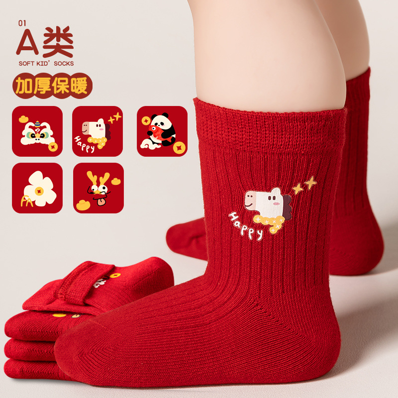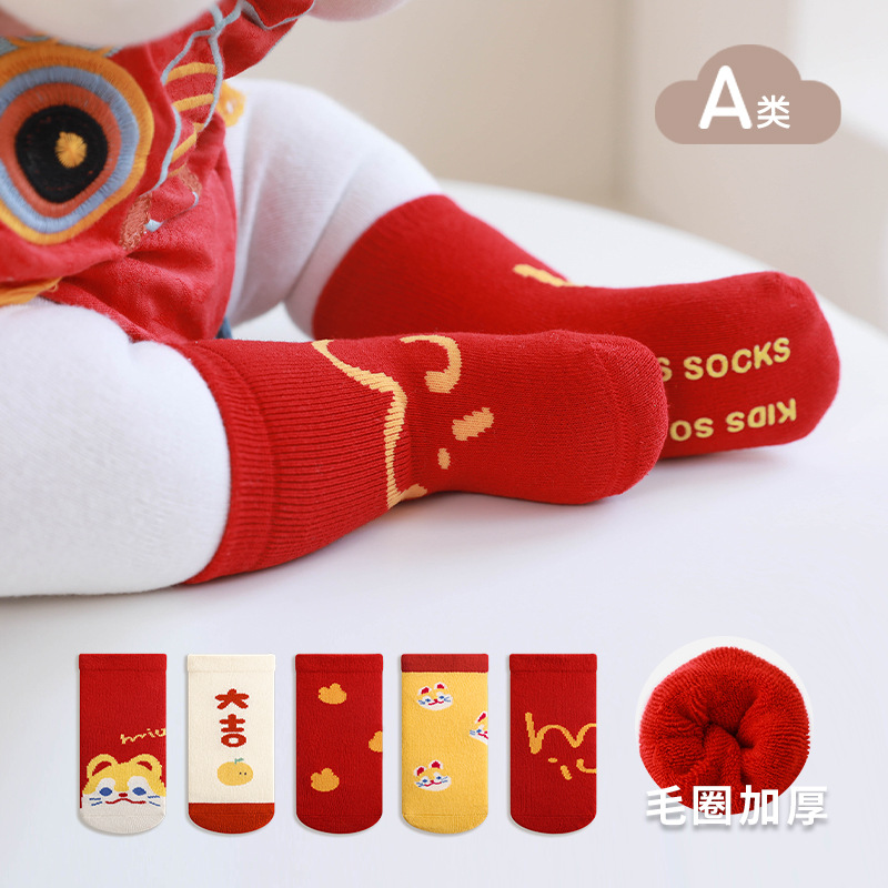 2024冬の新商品の赤ちゃんの靴下の大きい赤い保温の赤ちゃんの新年の満1歳の満月の百日の骨がない中筒の靴下