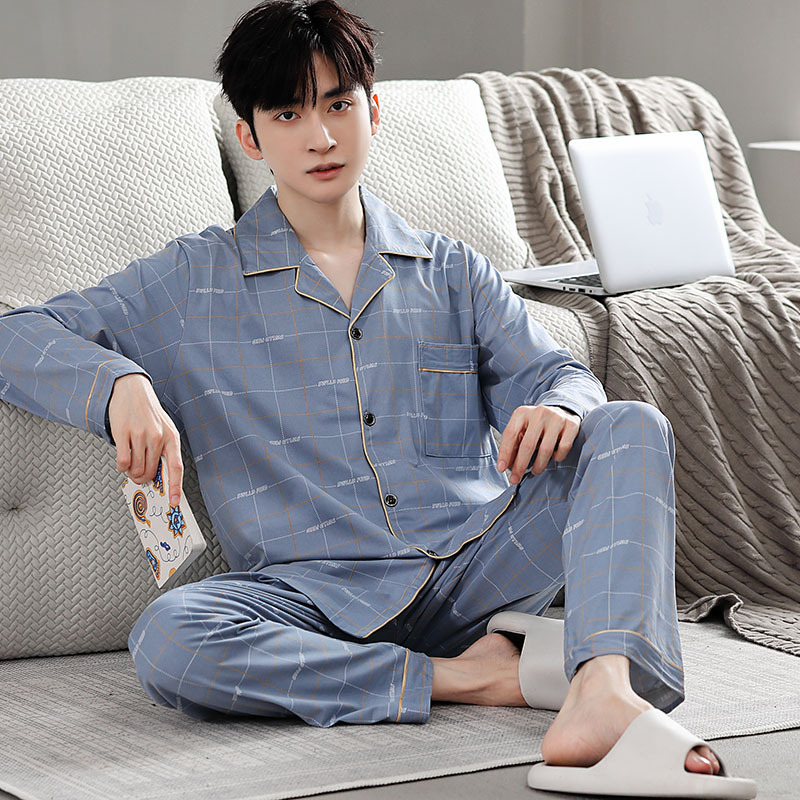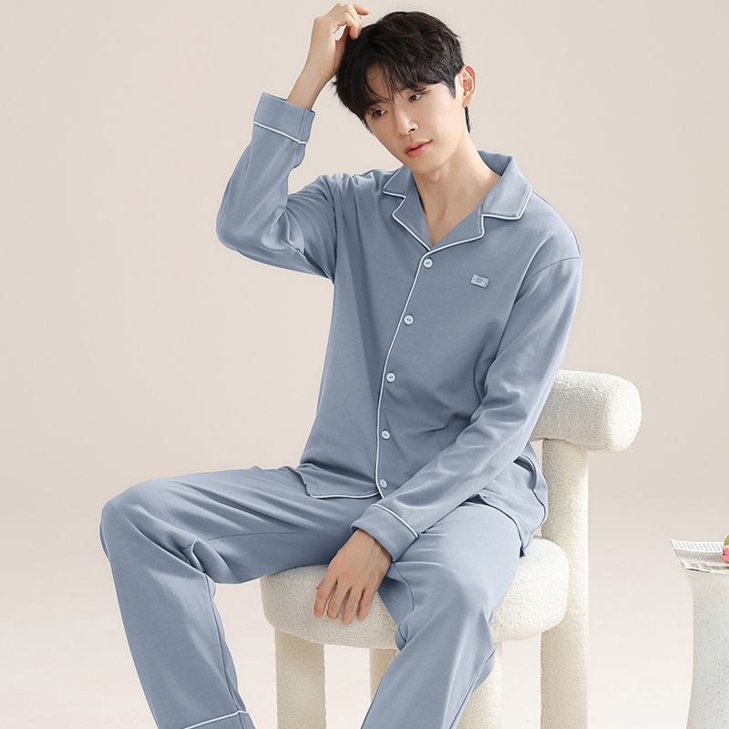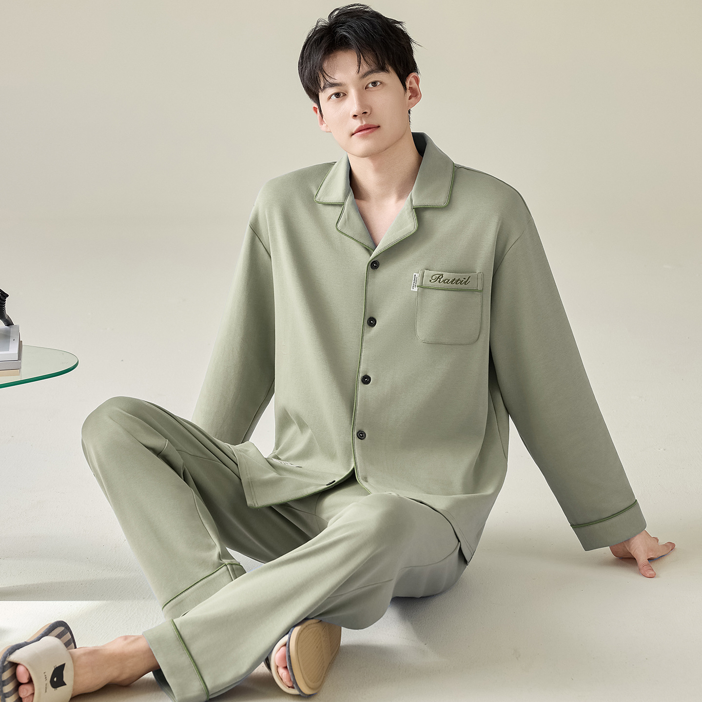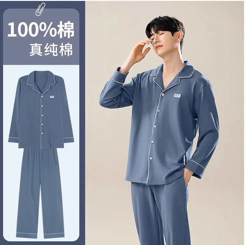 100%纯棉长袖开衫翻领睡衣男韩版新款高档全棉家居服两件套装外穿
