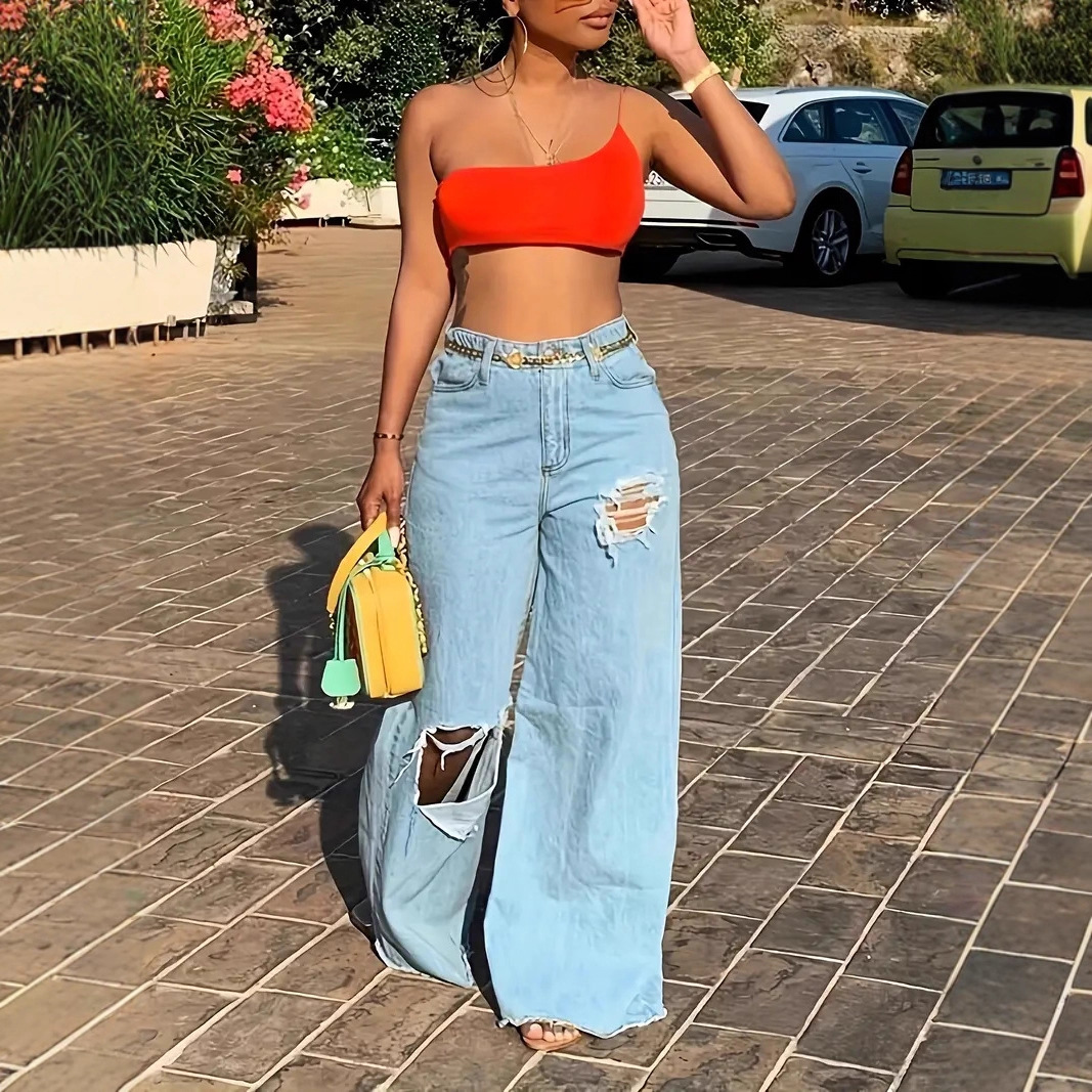 跨境电商 temu 亚马逊大码女装浅蓝不规则大破洞高腰无弹宽松阔腿