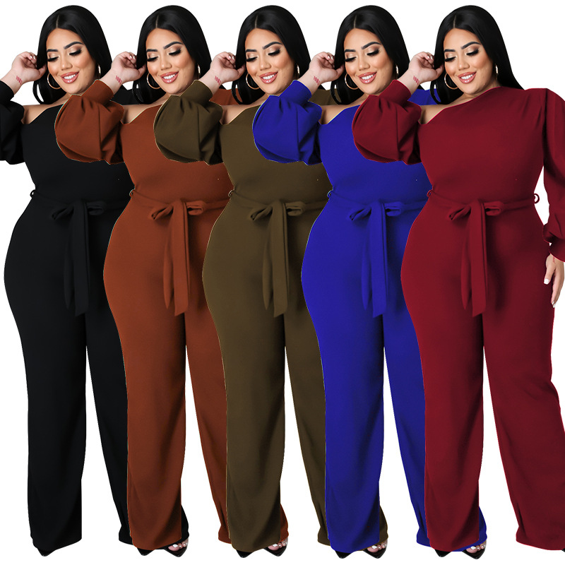 MY1007跨境欧美大码女装纯色灯笼袖斜肩有腰带时尚连体裤亚马逊新
