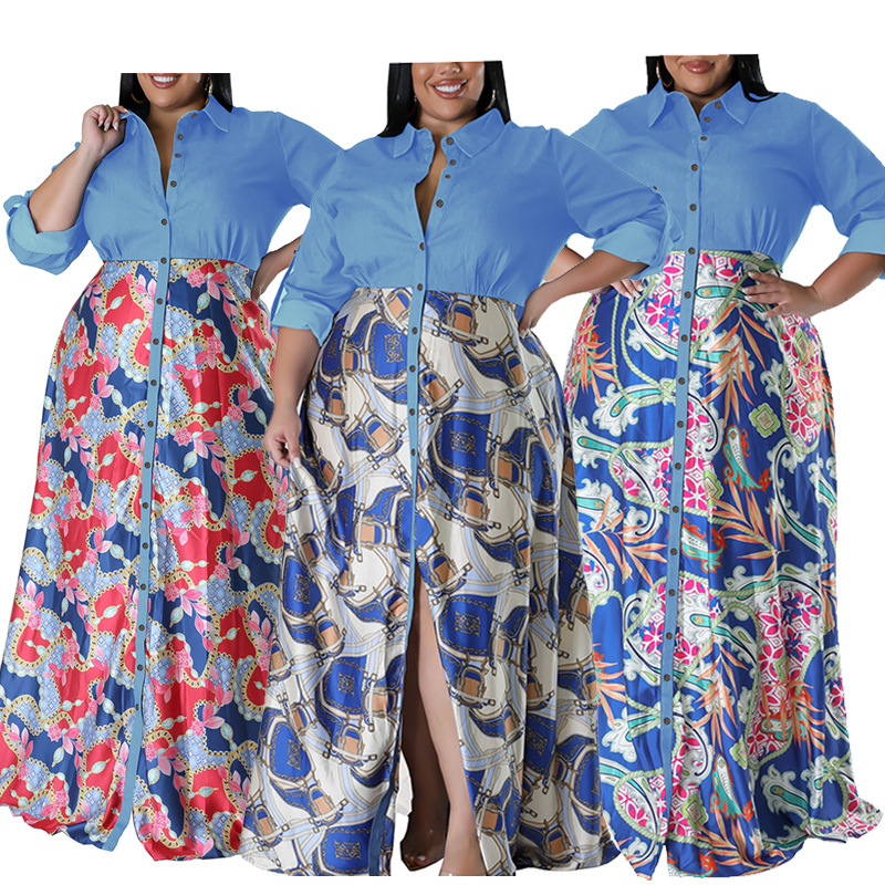 DZ102跨境大码女装短袖印花立领长款连衣裙源头工厂
