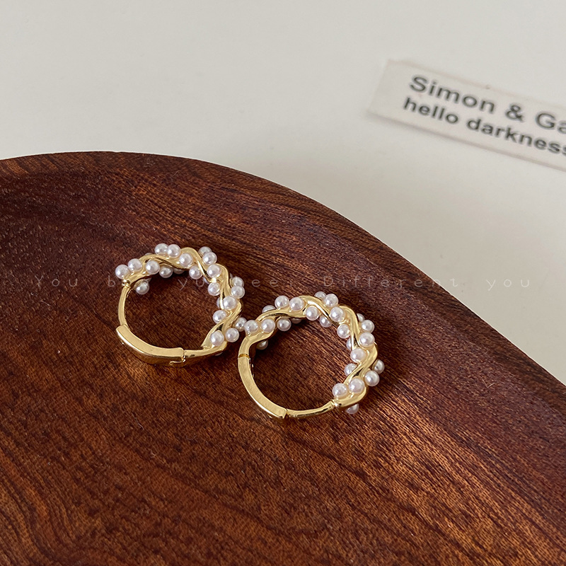 金色のフランス風真珠麻花輪イヤリング女性のレトロなデザイン感のある雰囲気の耳輪が精巧で豪華で高級な耳飾りです。