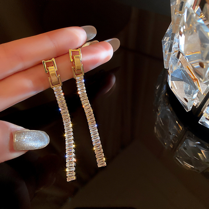 真金メッキ925銀針ジルコン長フリンジイヤリング気質シンプルファッション超フラッシュチェーンイヤリング女性