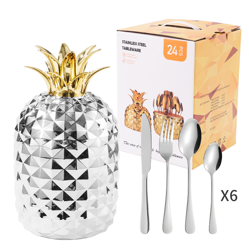跨境不锈钢菠萝蛋礼盒餐具套装24件套刀叉勺酒店牛排刀西餐具外贸