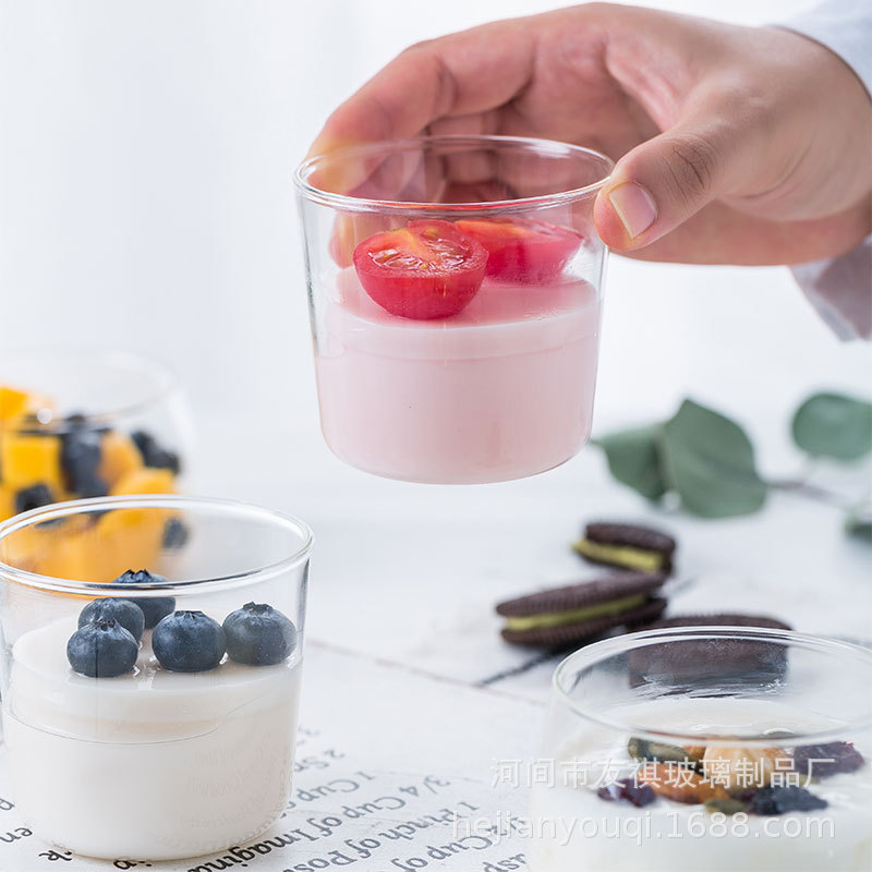 日本式のシンプルなヨーグルトの布丁の杯の牛乳の杯の透明な双皮の乳のコップの創意のグラスの小さいコップのムースの杯