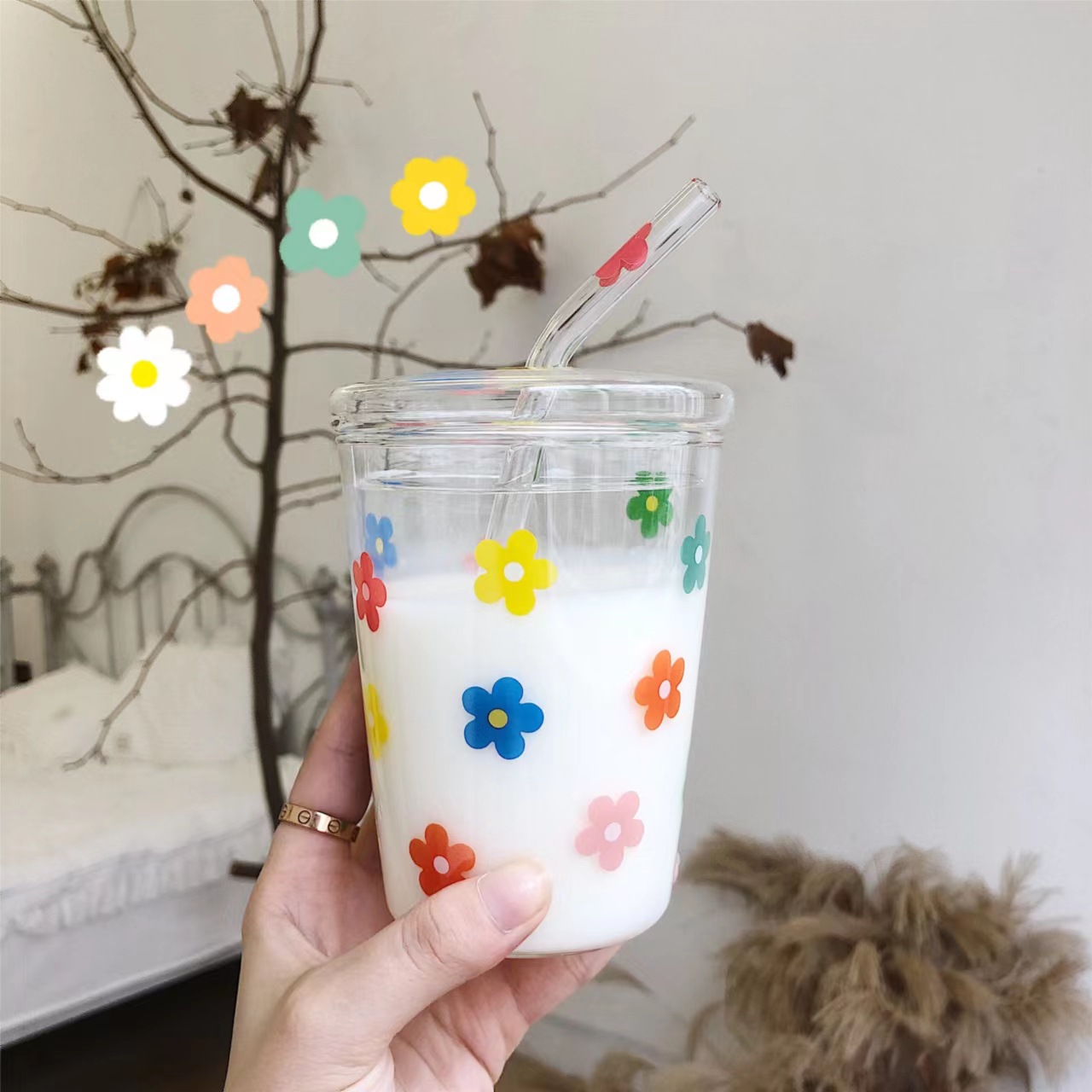 小さい花のイチゴのガラスのストローのコップの小さい清新なジュースの牛乳の朝食の杯のレモンミルクティーカップのカップルの杯は蓋があります。