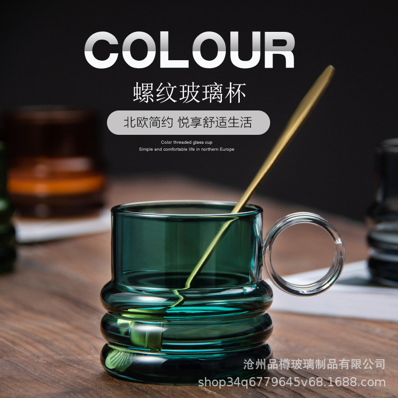 カラーガラスカップ、リングハンドル付きカップ、コーヒー飲料カップ、ネジ付き水カップ、ミルク朝食カップ、リング型、耐熱性