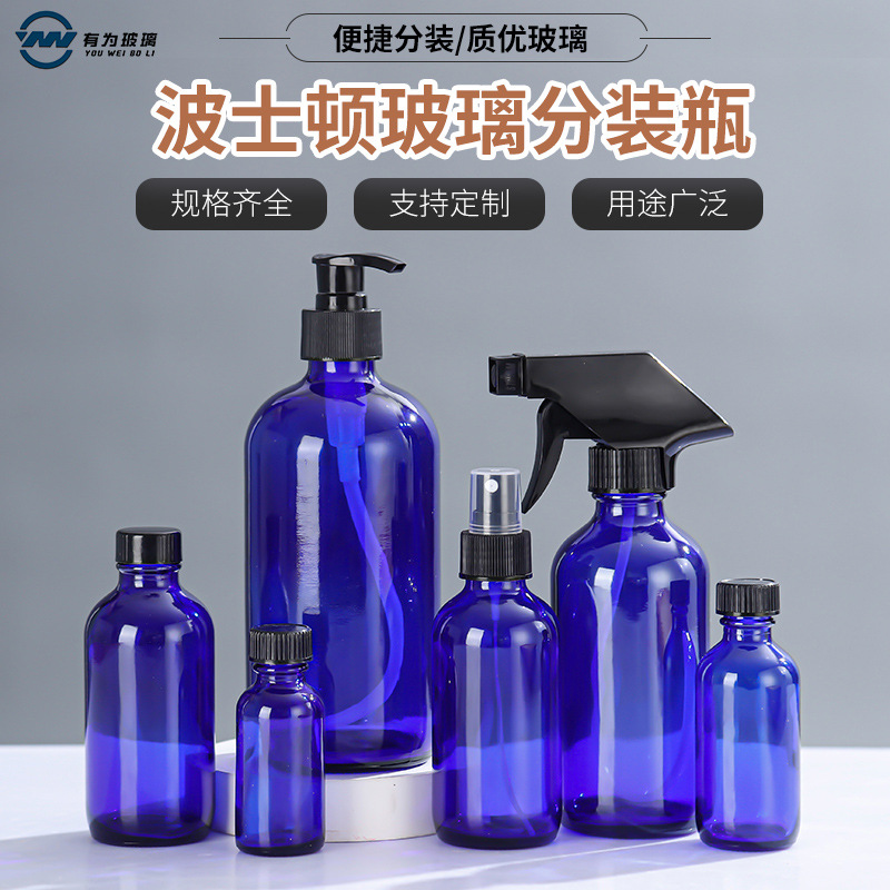 メーカー卸売り大容量の青い手洗い液ガラス噴霧瓶ボストン液瓶押圧精油原液空瓶
