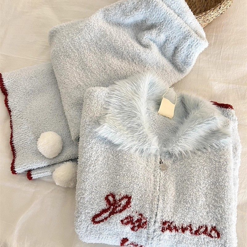 2025新款睡衣女款秋冬季半边绒长袖休闲蓝色字母学生珊瑚绒家居服