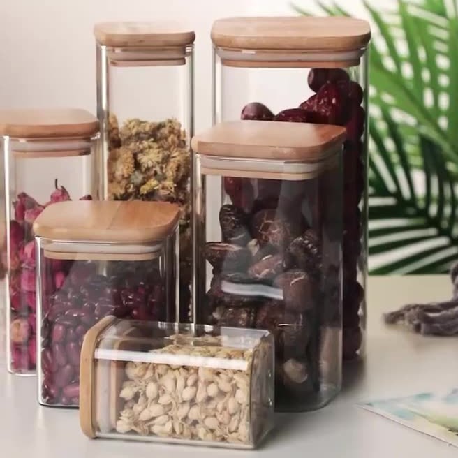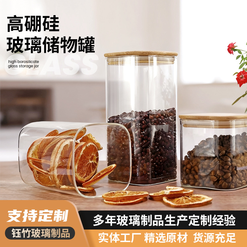 高ホウ素シリコン高透明ガラスキッチン家庭用茶葉雑穀収納タンク貯蔵タンク角形密封缶竹蓋カップ