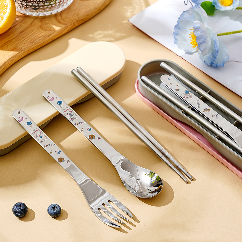 304 ステンレス鋼スプーン箸セットかわいい漫画子供ポータブル収納ボックス屋外子供食器
