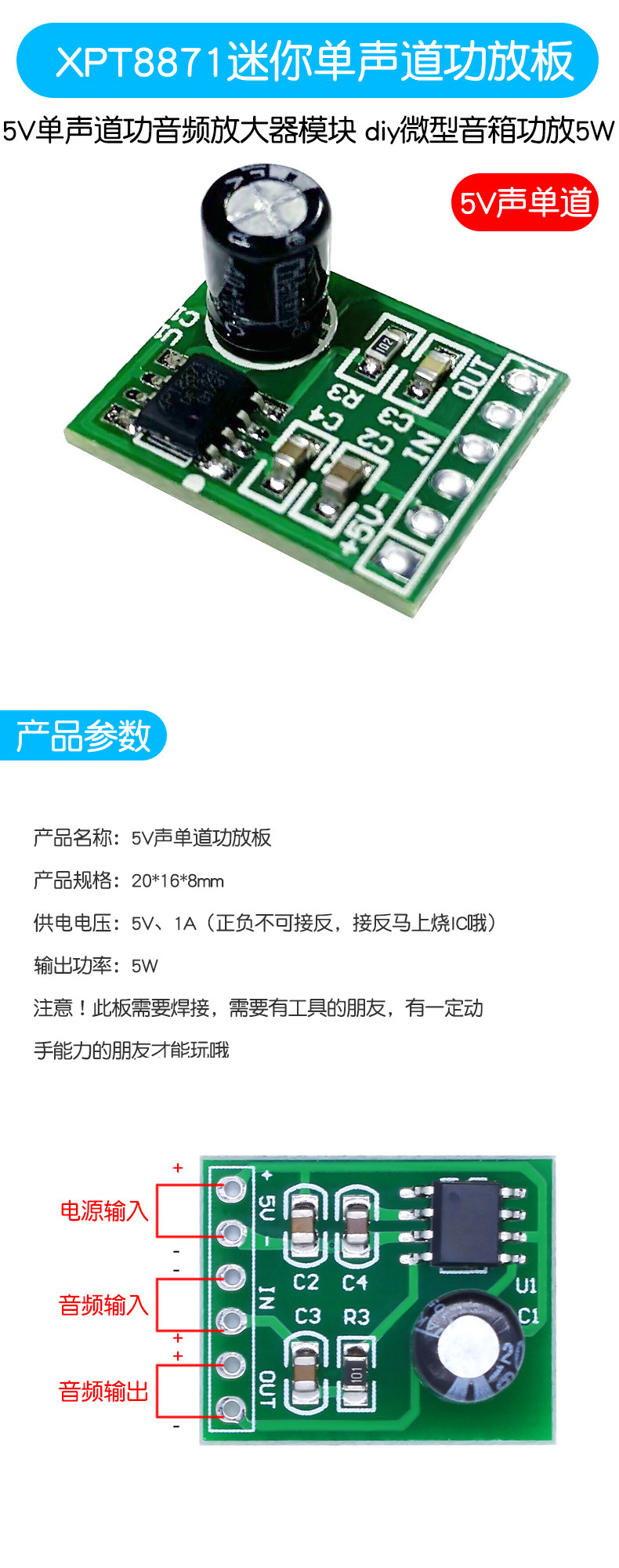 XH-M125歌劇機拡大板XPT8871モノラル功放板リチウム電池功放板6W