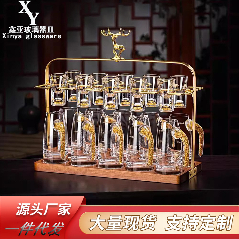 圆肚斜口金箔分酒器套装(梦泪酒具):外箱尺寸:44x35x56cm,外箱毛重:19.15kg;皮箱尺寸:32.5x26.5x9.5cm,皮箱毛重:2.3kg;