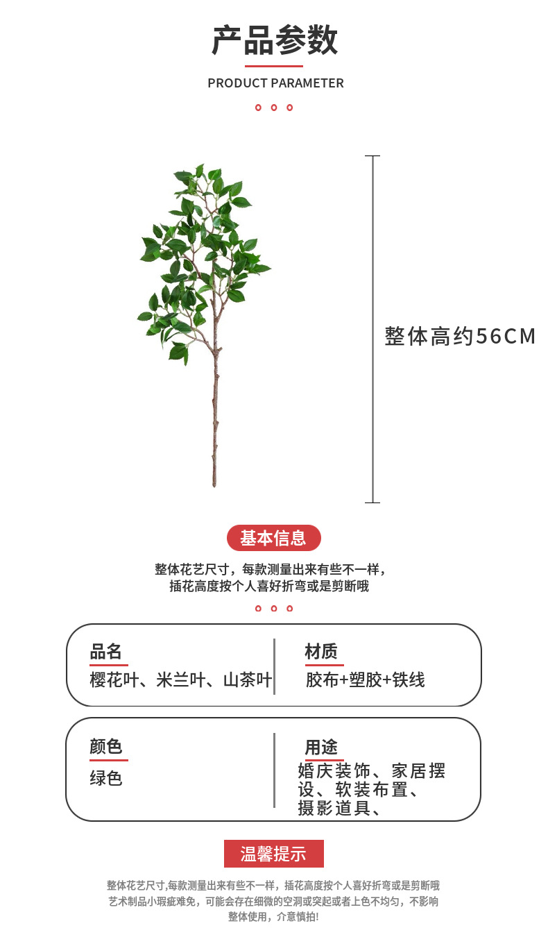 短い枝の模造桜の葉、山茶葉、ミニフィカスの葉、人工枝、緑の葉、フラワーアレンジメント用装飾葉