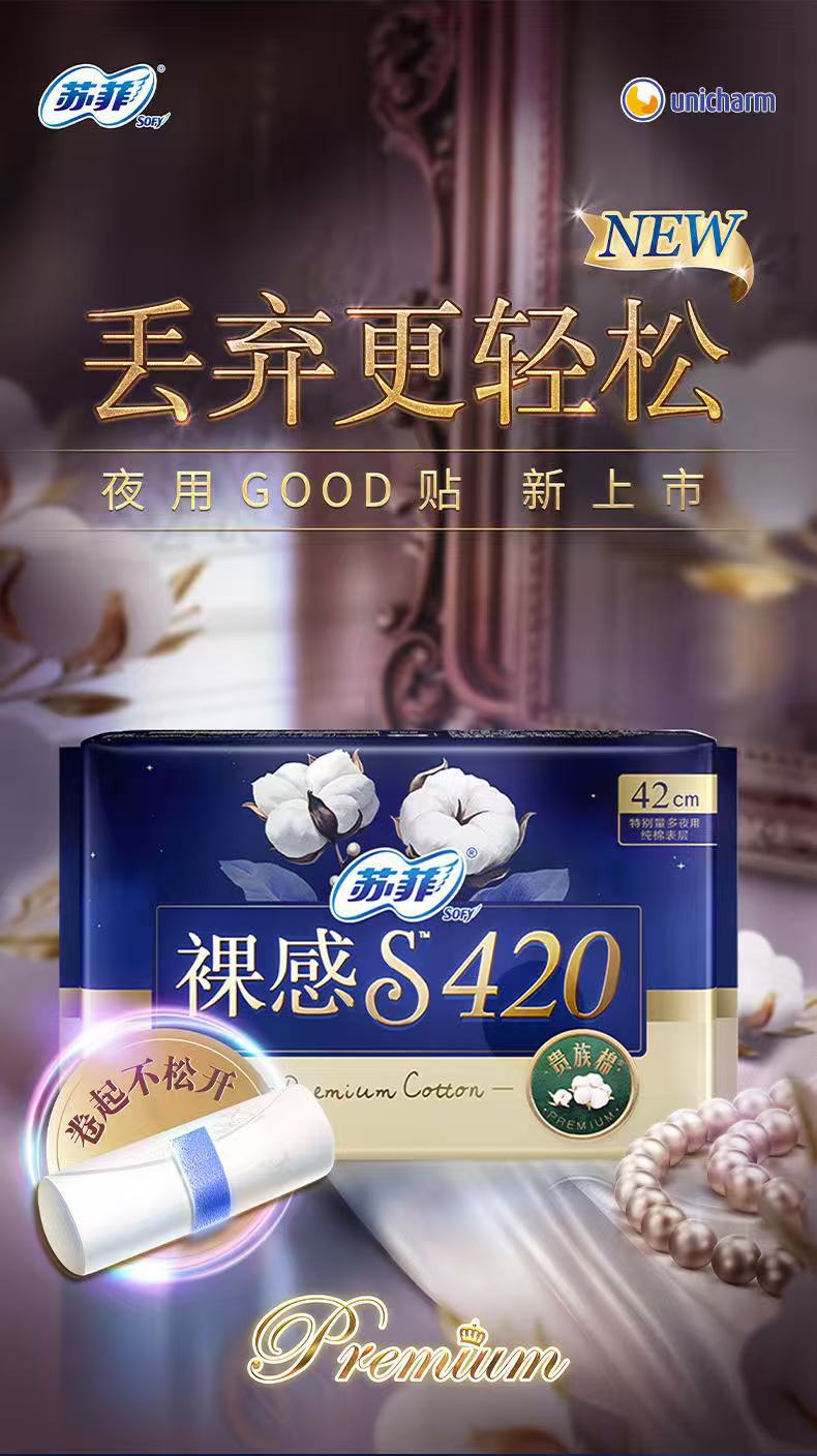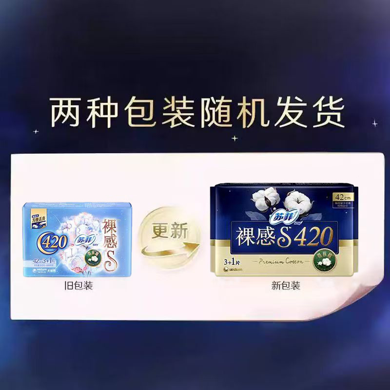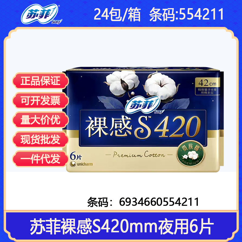 苏菲卫生巾裸感S贵族棉420mm纯棉夜用姨妈巾6片 整箱批发代发正品