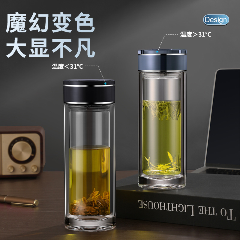 茶水分離カップ 二重ガラスカップ ビジネスウォーターカップ ポータブルフィルター付き茶こしカップ ギフト卸売 オフィス温度表示