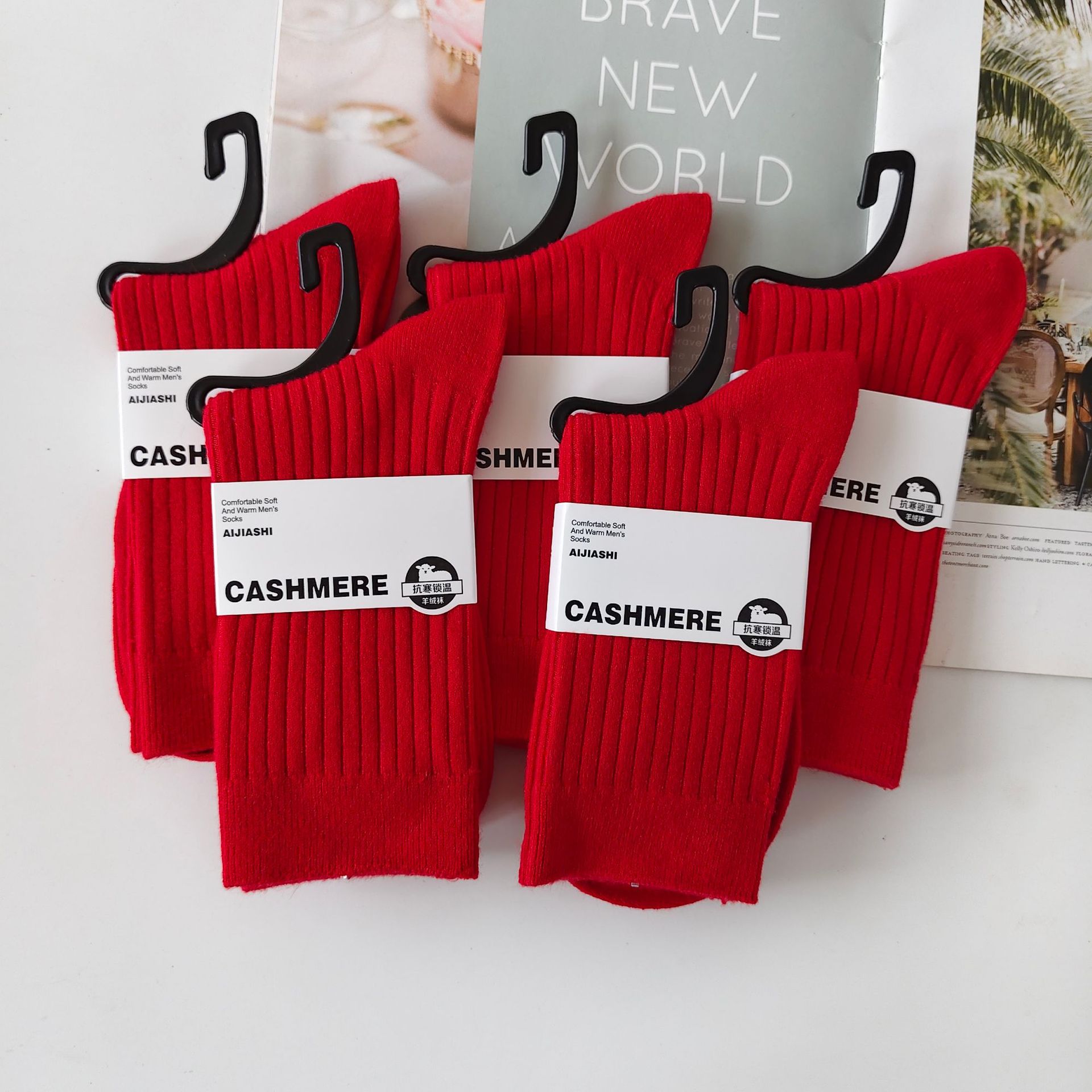秋冬红色羊绒袜子男女双针保暖蓄热加厚大红羊绒袜男女中筒羊绒袜