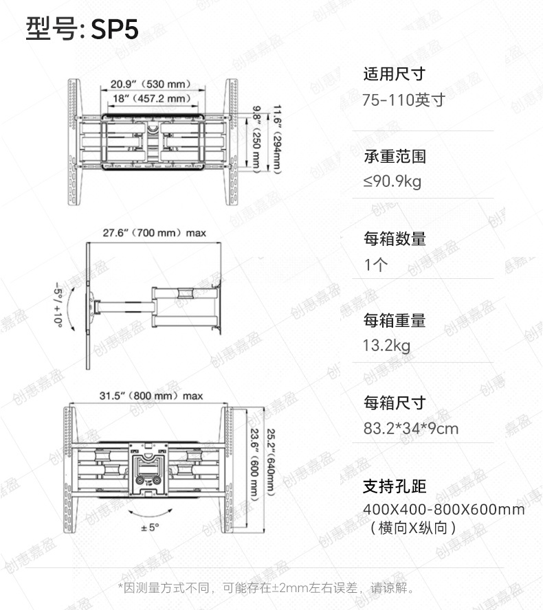 P4【32-55inch、耐荷重27.2kg】,757-L400【32-75inch、耐荷重36.4kg】,P6 [45.5kgまで耐えられます],P65【55-85inch、耐荷重68.2kg】,SP2【40-80inch、耐荷重68.2kg】,SP5【75-110inch、耐荷重90.9kg】