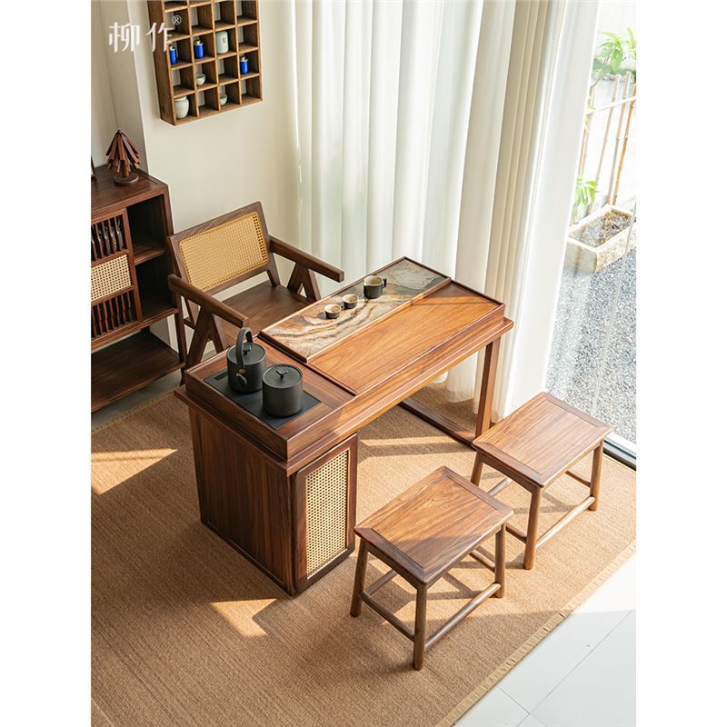 柳作新中式阳台茶桌实木小户型家用现代简约黑胡桃木可推拉泡茶桌