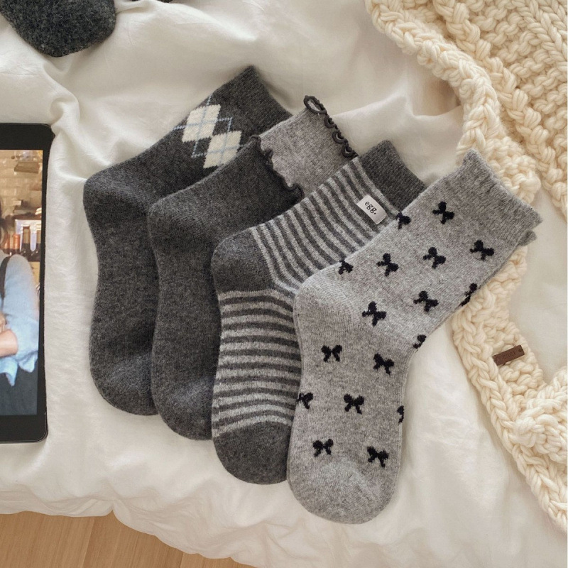 韩系加厚绵羊毛格雷系灰色中筒袜布标蝴蝶结菱格双木耳边堆堆袜