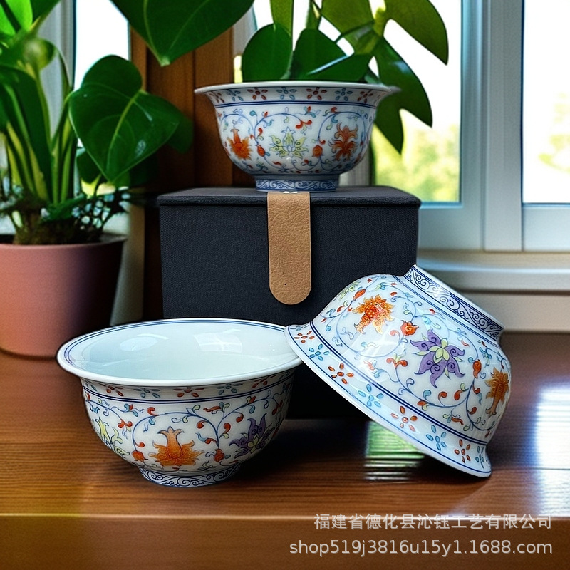 古風な蓋の景徳の青と花の釉薬の中の赤い3才の碗の陶磁器の工夫の茶器をまねてお茶の碗の清明の上河図の壺を浸します。