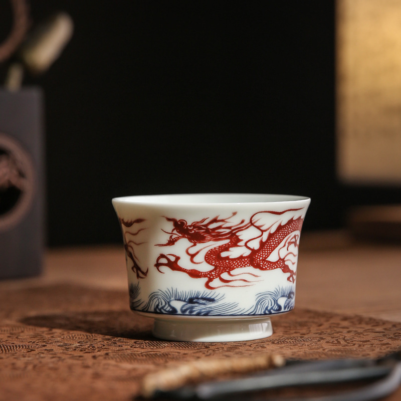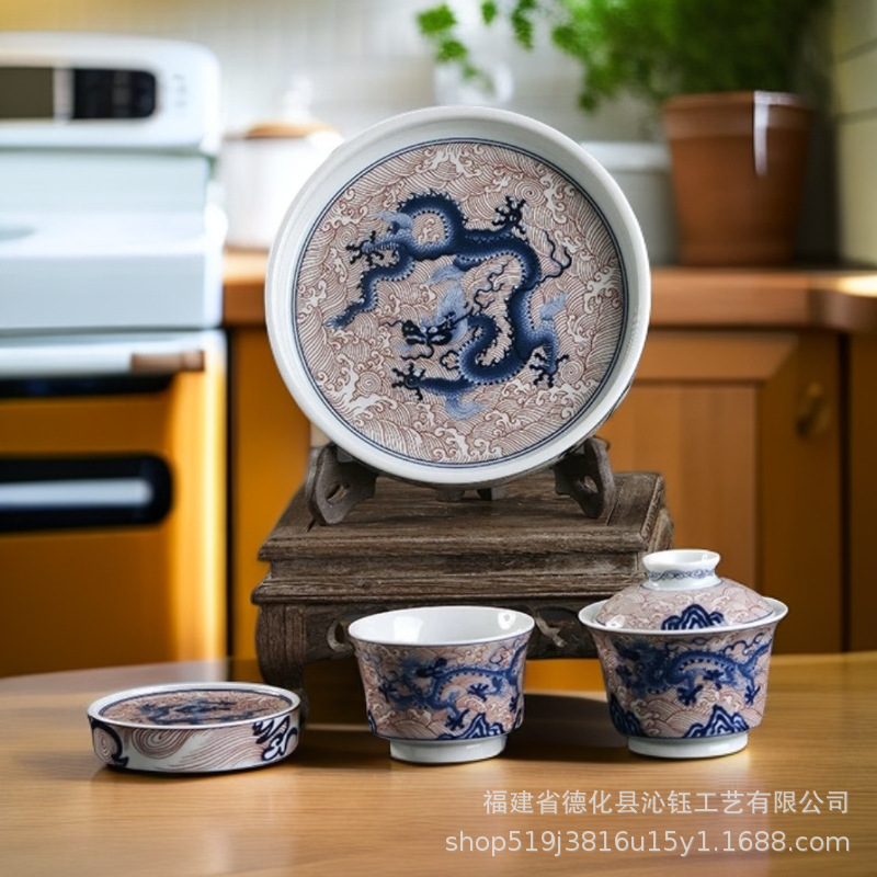 青花瓷釉里红龙功夫茶具套装复古陶瓷家用泡茶盖碗主人杯壶承茶托