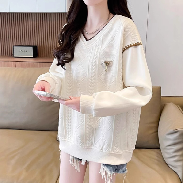 日系の新型vネックのガードルの女性2024秋の怠惰な風のデザイン感の熊の長袖の大きいサイズのガードルの女性の卸売り