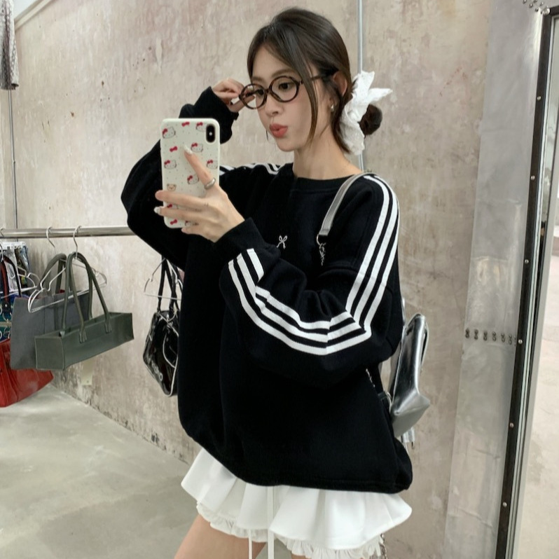 三本線長袖スウェットシャツ レディース 初秋新作 スポーツ風 リボン刺繍 2025年新作 丸首トップス レディース トレンド